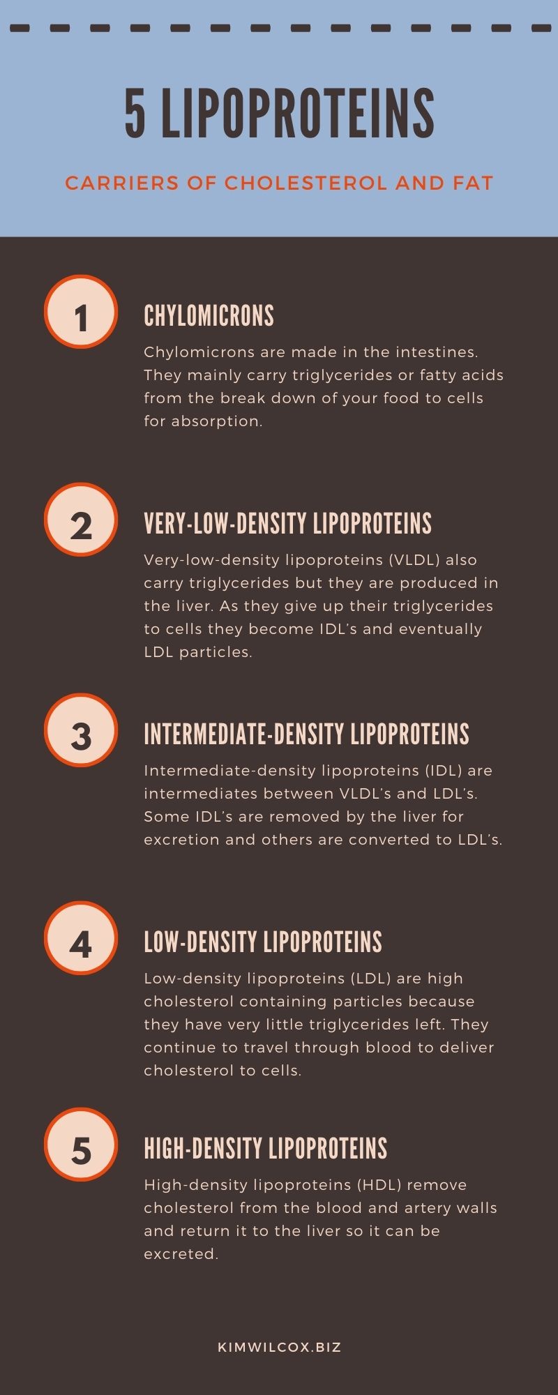 If you wondered why HDL is “good” cholesterol and LDL is “bad” cholesterol, it all boils down to delivery! Cholesterol is a fat that does not mix well with blood, similar to oil and water. In order to carry cholesterol and other fats to various cells they must be packaged with protein carriers known as lipoproteins. There of 5 different lipoproteins that vary in shape and form depending on the task at hand.