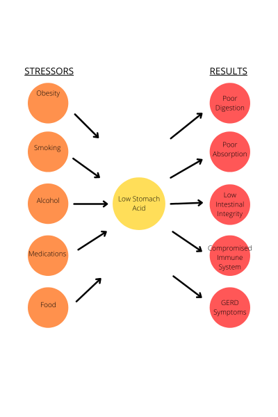 In fact, although there are some who have true high stomach acid, all the factors listed above that cause GERD can be explained by low stomach acid. Low stomach acid is a result of stress. Obesity, smoking and alcohol use all create physical stressors on the body. Environmental stressors like your job, relationships and toxins can all cause a decreased release of stomach acid. Medications like acid blockers induce even lower stomach acid and foods that seem to cause GERD symptoms are most likely not digested well due to low stomach acid.